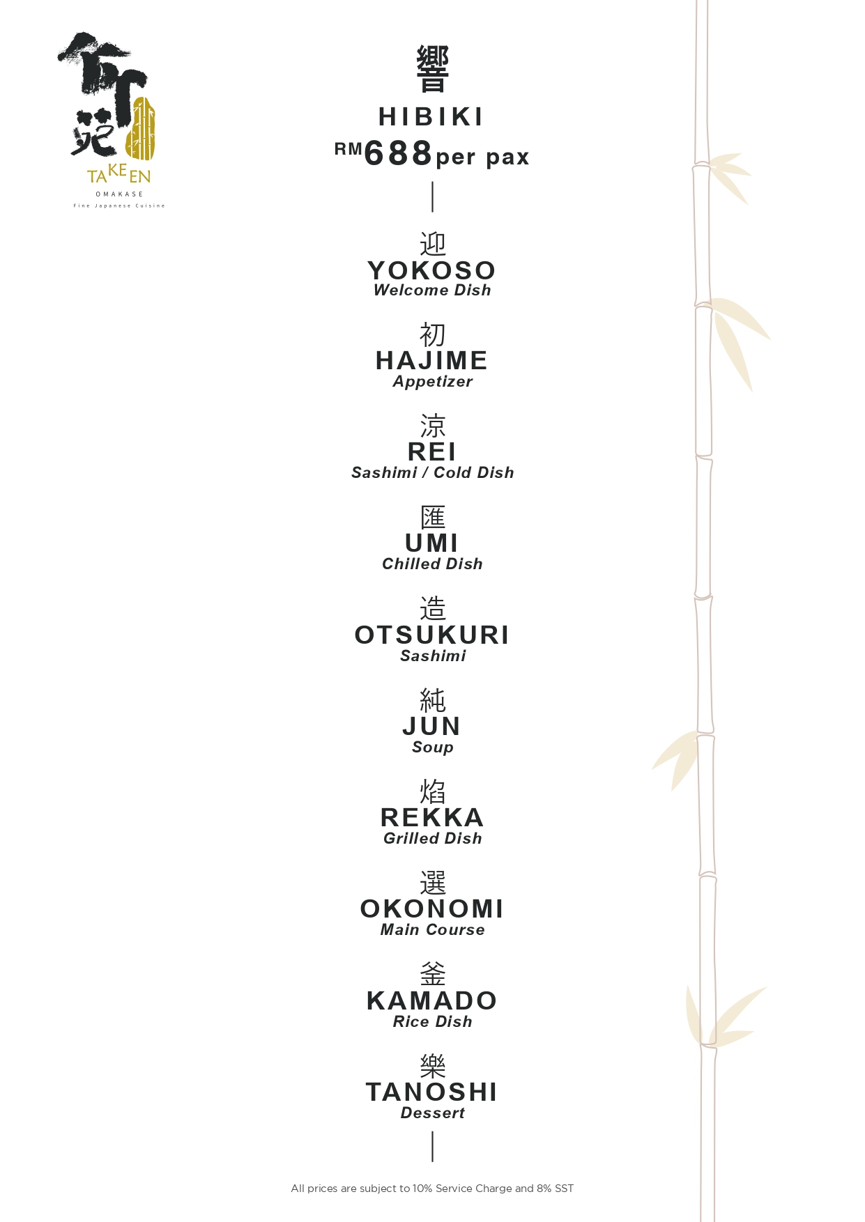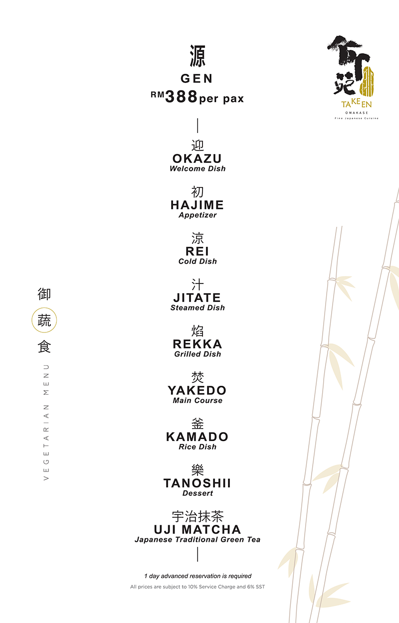 "Kappo" means "cut and cook" in Japanese, and "Omakase" means "let the chef to decide." Kappo Omakase is a multi-course meal specially prepared by the chef, based on the best available ingredients of the day. More than 90% of the dishes served at TaKeEn Omakase are cooked cuisine.