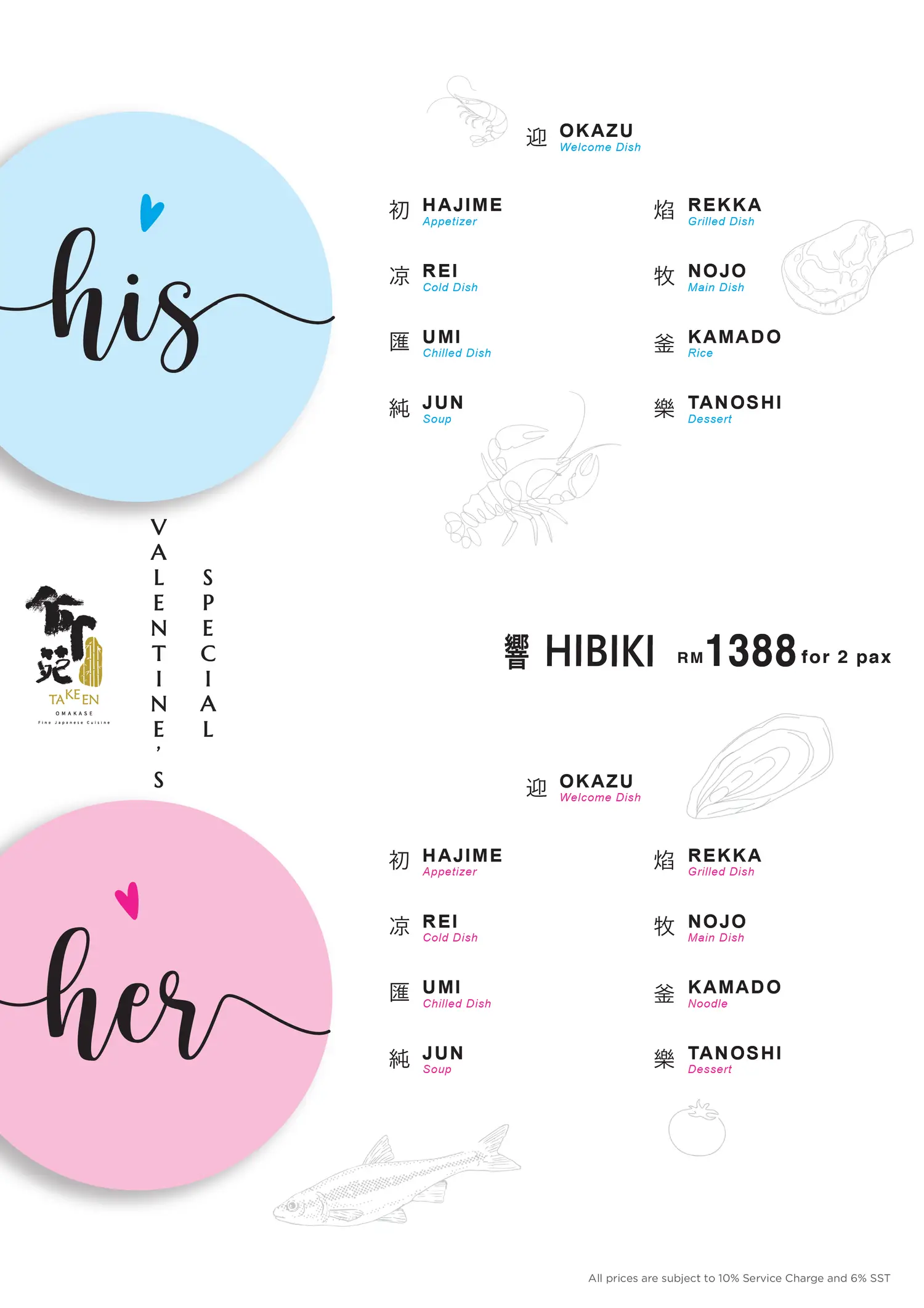 The entire dining experience at TaKeEn Omakase will last approximately 1 hour and 30 minutes.
